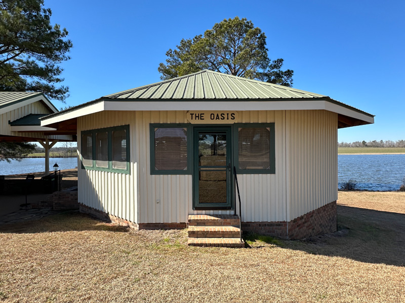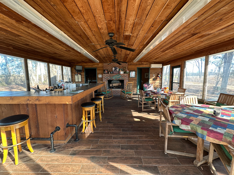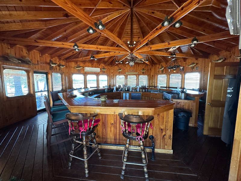 ~ Clubhouse overlooking the lake: big circular bar, cypress walls, pine floors, half bathroom, 2 covered pavilions outside (24×26 with fireplace and 31×52).