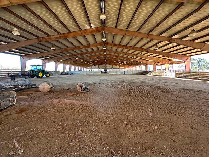 ~ Massive, covered 112×235 riding arena with steel frame, 24×112 lean-tos on each end, 22×50 lean-to on one side